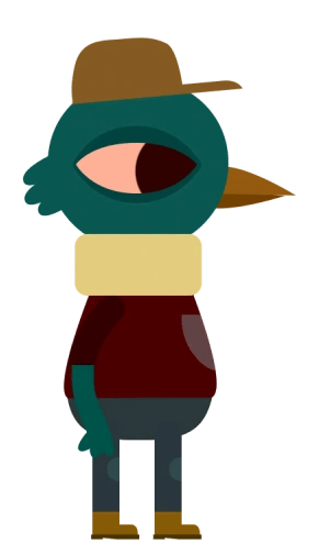 The bird has a yellow scarf / neck-brace, a red shirt with a lighter red shield on it, torn jeans with brown shoes, and a brown hat that matches their beak and shoes. They also have red eyes and a turquoise feather color.