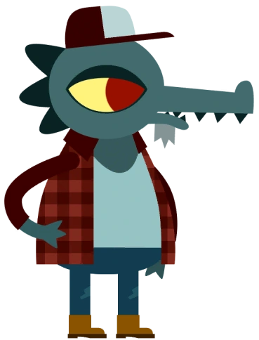 The crocodile has a red jacket with a light grey-blue shirt, torn jeans and brown shoes as well. He has red eyes as well and a red and white hat. He also has a light grey beard.